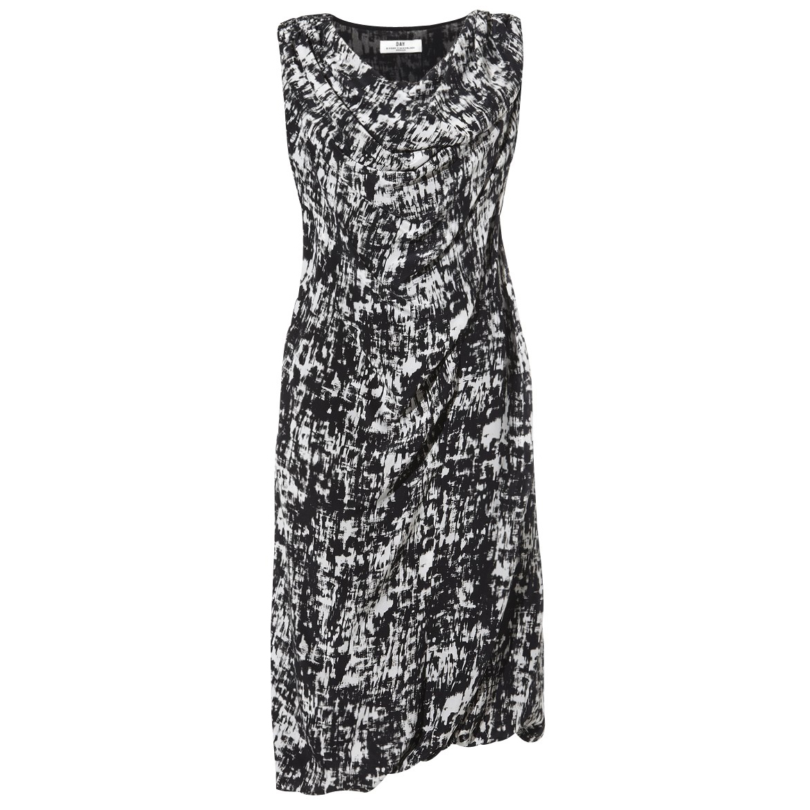 Effortlessly tap into the graphic printed trend with this monochrome sleeveless dress by Day Birger et Mikkelsen. Beautifully draped, with an asymmetric hem , it will easily take you from desk to dinner.