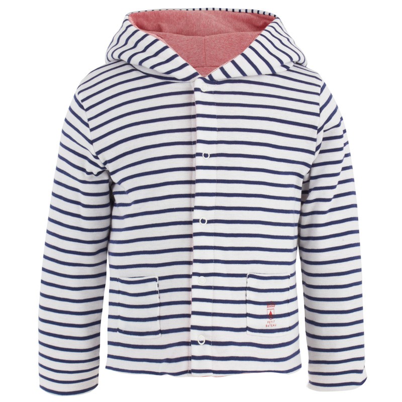 The perfect cover up for your little boy this season comes in the shape of this reversible jacket from Petit Bateau. This nautical inspired piece boasts navy and white stripes on one side, with thin red and white stripes on the other. Crafted from the finest cotton, this hooded piece also features two small pockets and popper fastenings.